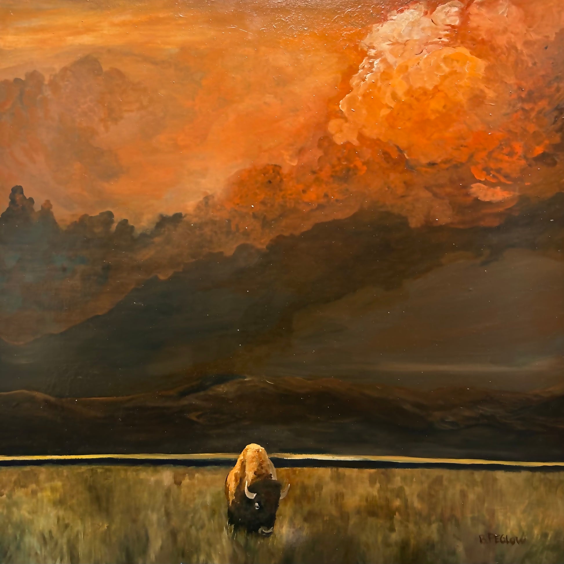buffalo art print, wildlife wall art, western landscape painting, bison artwork, buffalo in field print, amber field art, stormy sky painting, mountain landscape art, western decor wall art, nature art print, dramatic sky artwork, animal wall decor, wildlife fine art print, great plains art, rustic wall art, southwestern home decor, archival art print, wildlife lover gift, western buffalo painting, modern western wall art