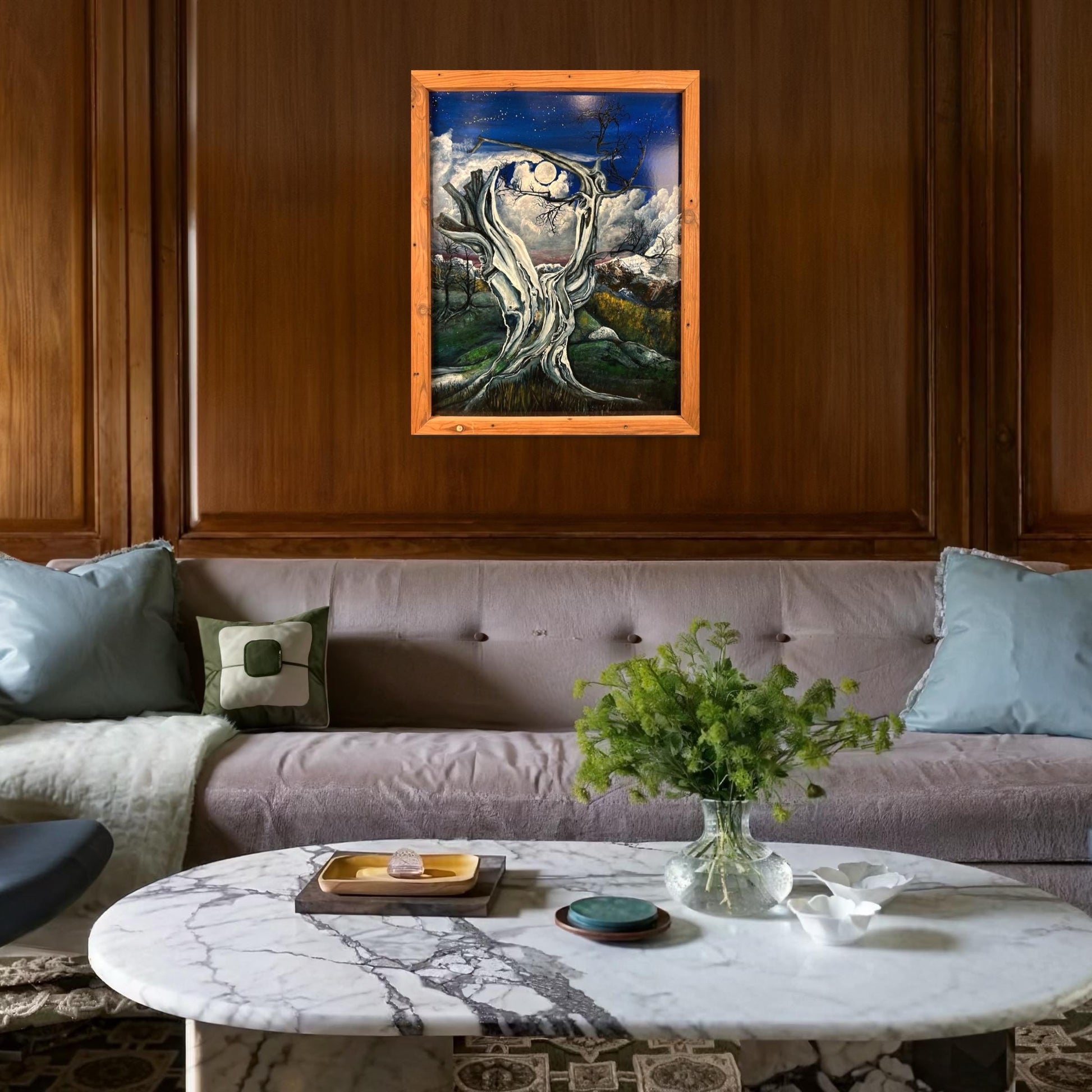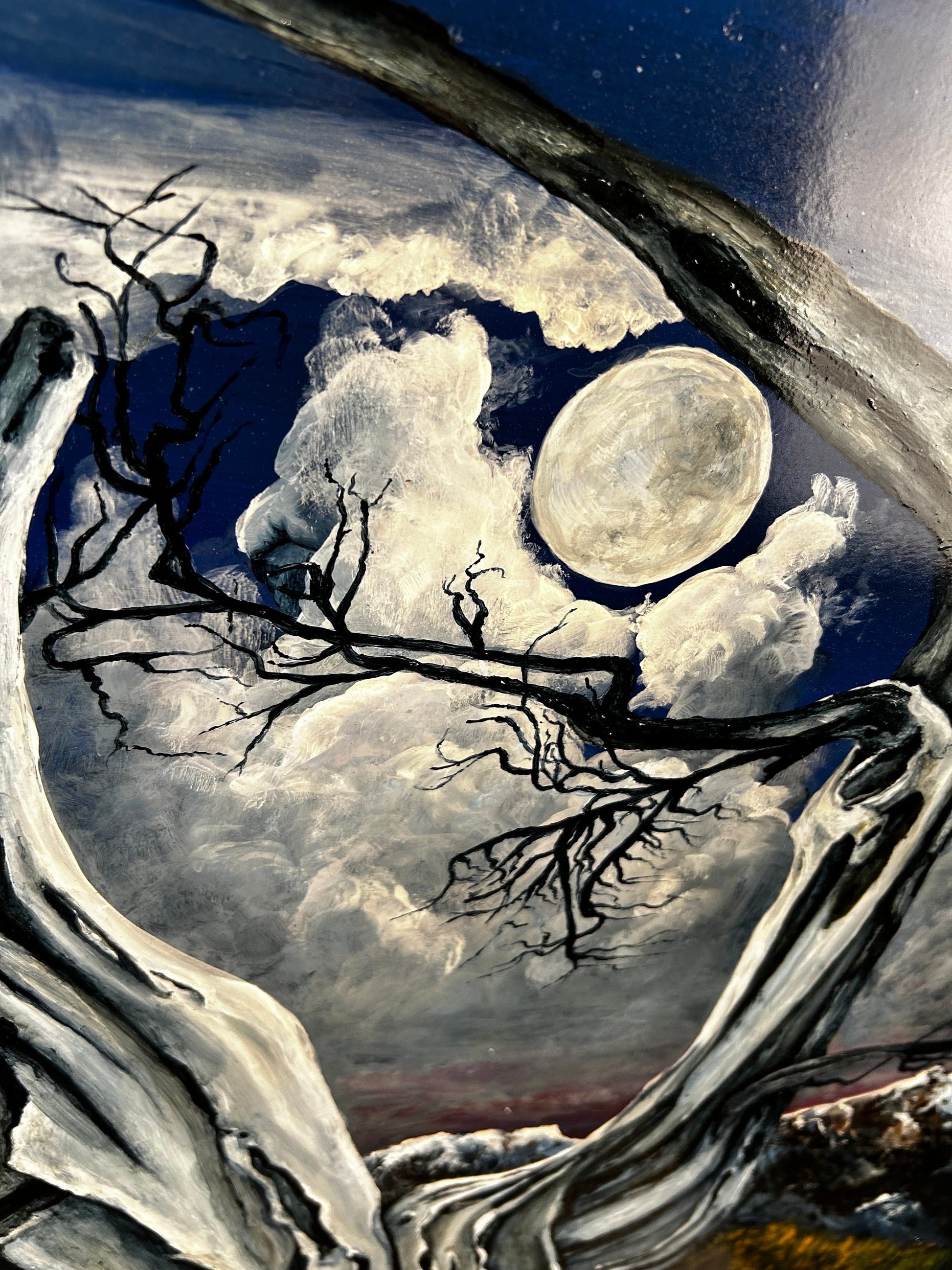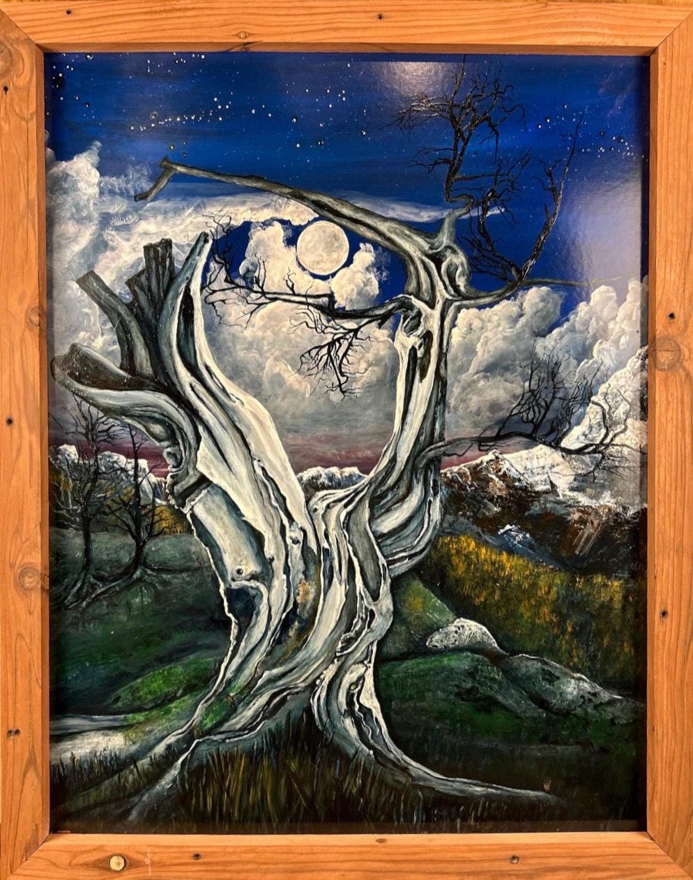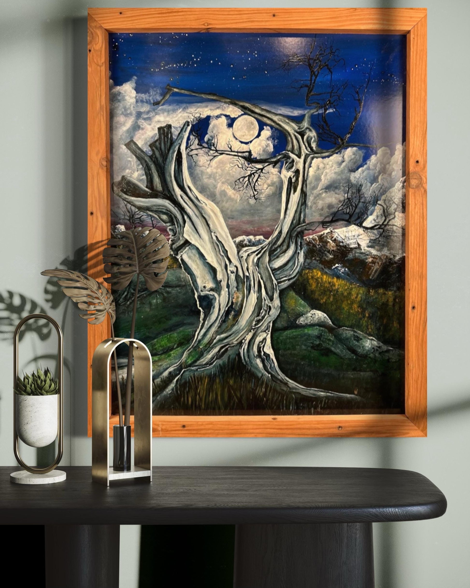 Step into the haunting beauty of this mesmerizing painting, where an ancient, gnarled tree stands silhouetted against the backdrop of a full moon veiled by drifting clouds. In the distance, majestic mountains rise, their peaks shrouded in mystery beneath the ethereal glow. Expertly crafted brushstrokes bring to life the stark contrast between the starkness of the foreground tree and the dreamlike quality of the moonlit landscape beyond. This evocative artwork captures the timeless allure of the night, inviting viewers to immerse themselves in the tranquil beauty of the natural world. Whether adorning a modern space or sparking conversation in a traditional setting, this stunning depiction of nocturnal serenity is sure to captivate and inspire.