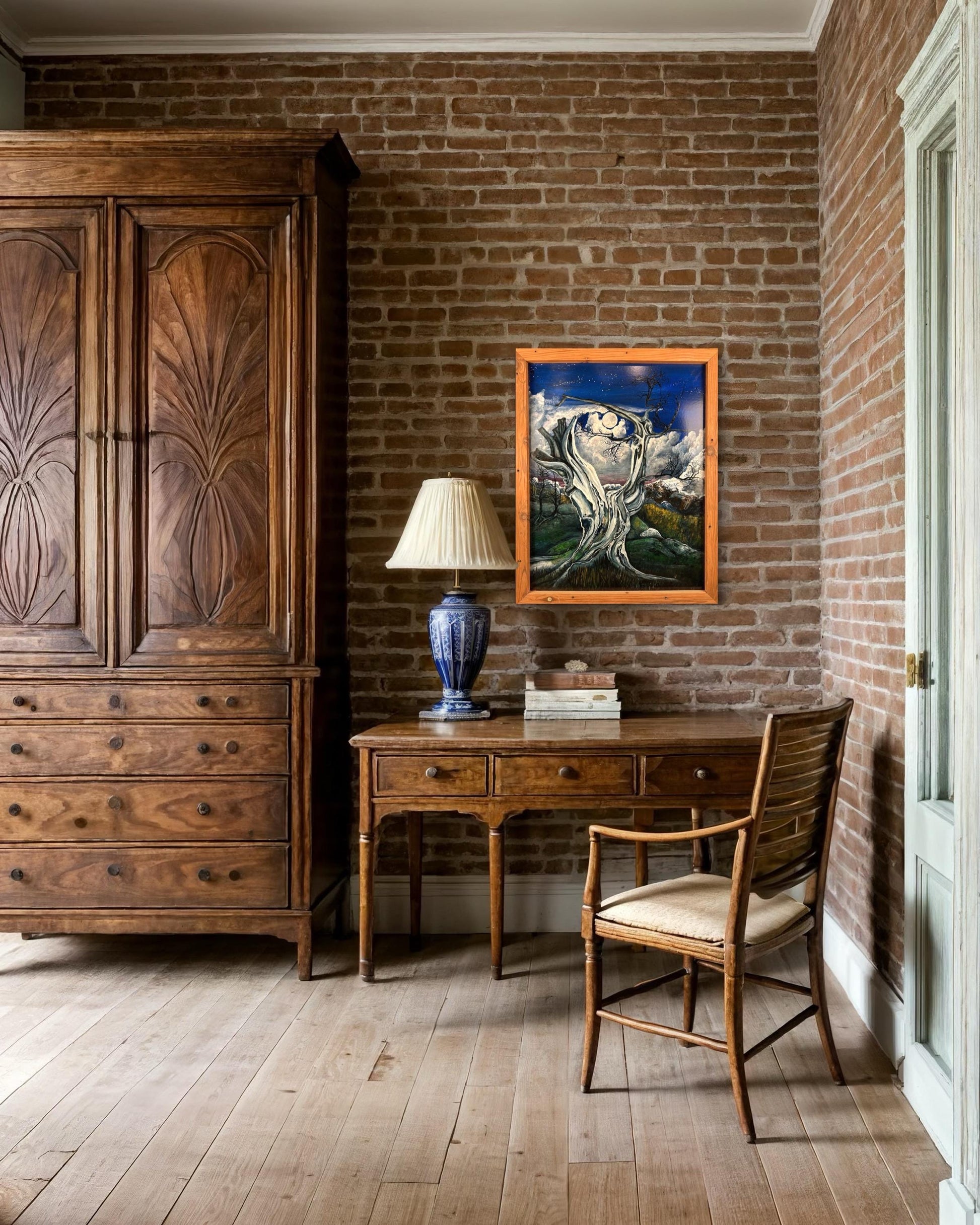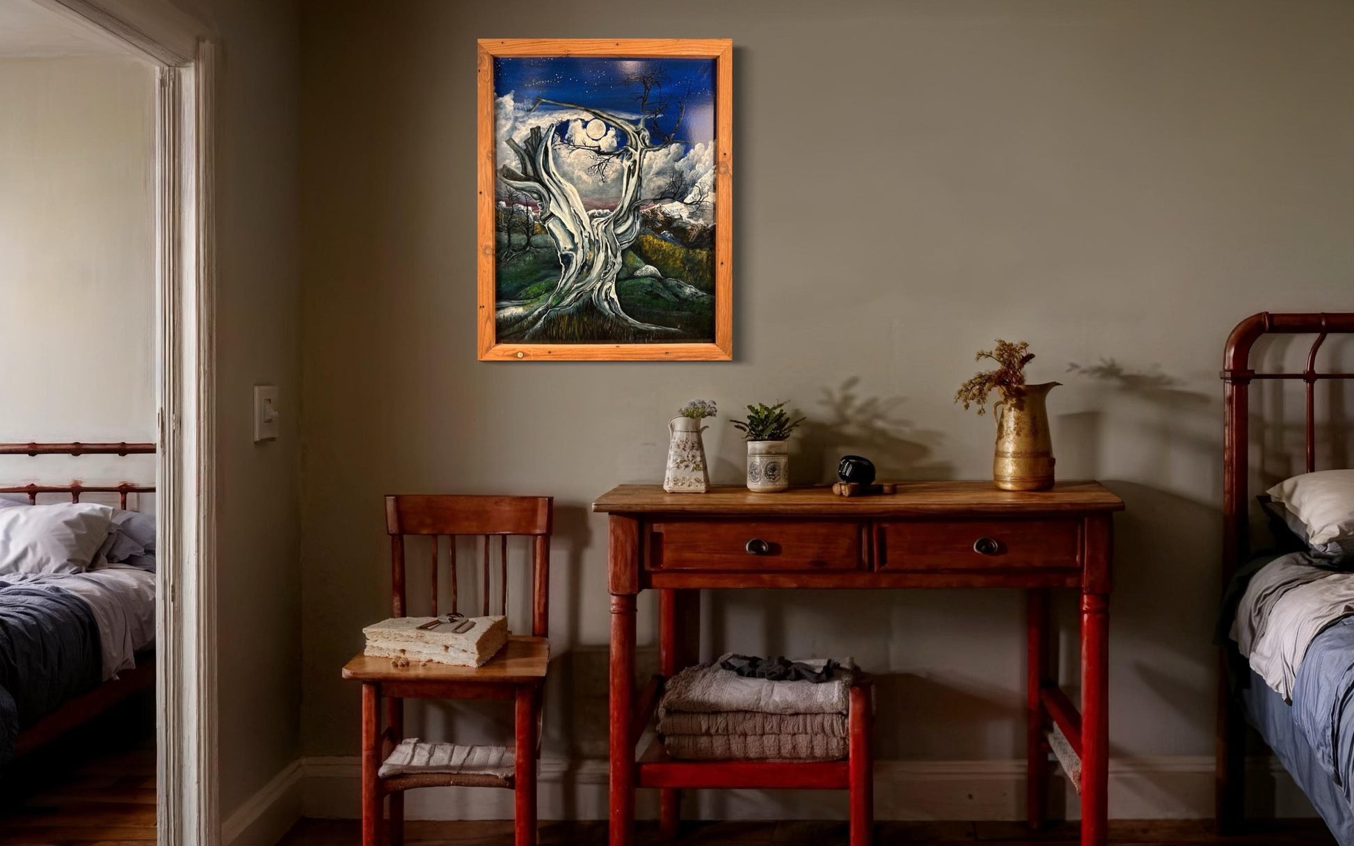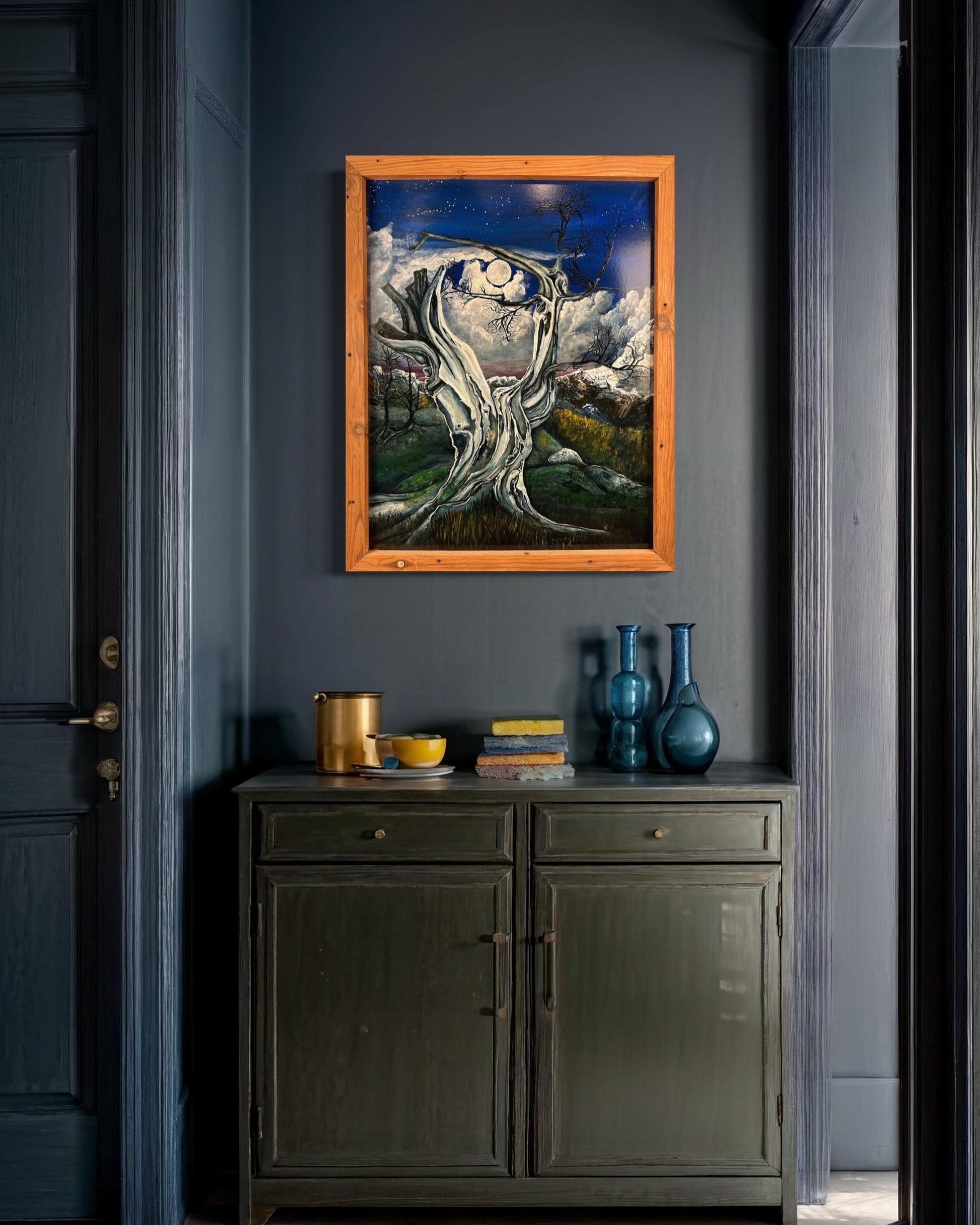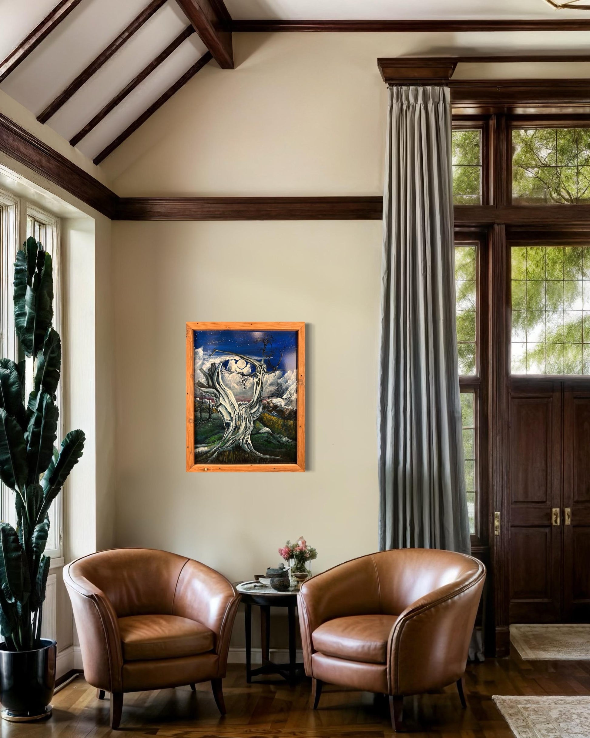 Step into the haunting beauty of this mesmerizing painting, where an ancient, gnarled tree stands silhouetted against the backdrop of a full moon veiled by drifting clouds. In the distance, majestic mountains rise, their peaks shrouded in mystery beneath the ethereal glow. Expertly crafted brushstrokes bring to life the stark contrast between the starkness of the foreground tree and the dreamlike quality of the moonlit landscape beyond. This evocative artwork captures the timeless allure of the night, inviting viewers to immerse themselves in the tranquil beauty of the natural world. Whether adorning a modern space or sparking conversation in a traditional setting, this stunning depiction of nocturnal serenity is sure to captivate and inspire.