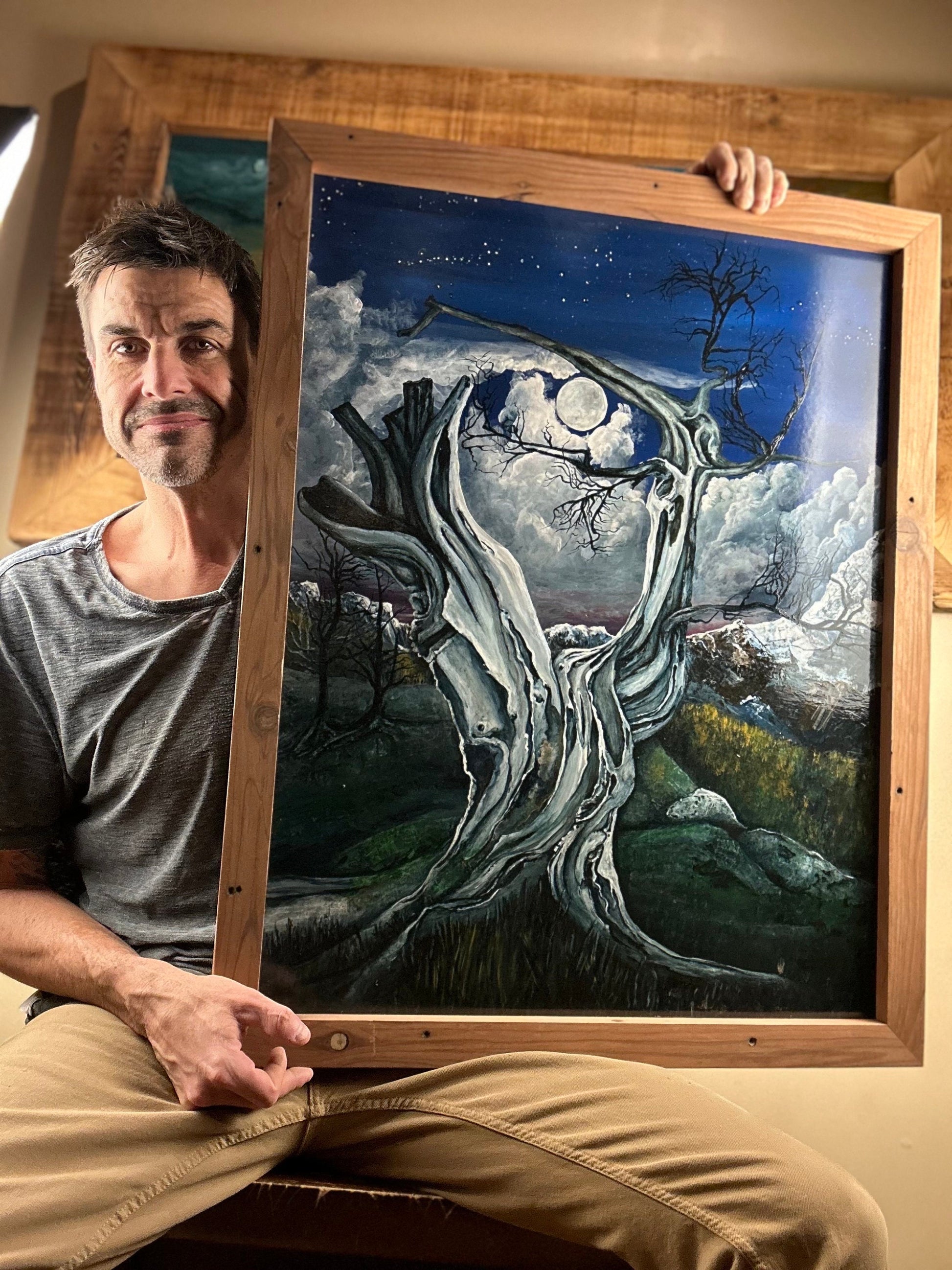 Materials: Acrylic Paint on Hardboard, Frame is reclaimed California Redwood from an old structure near my home in Minnesota