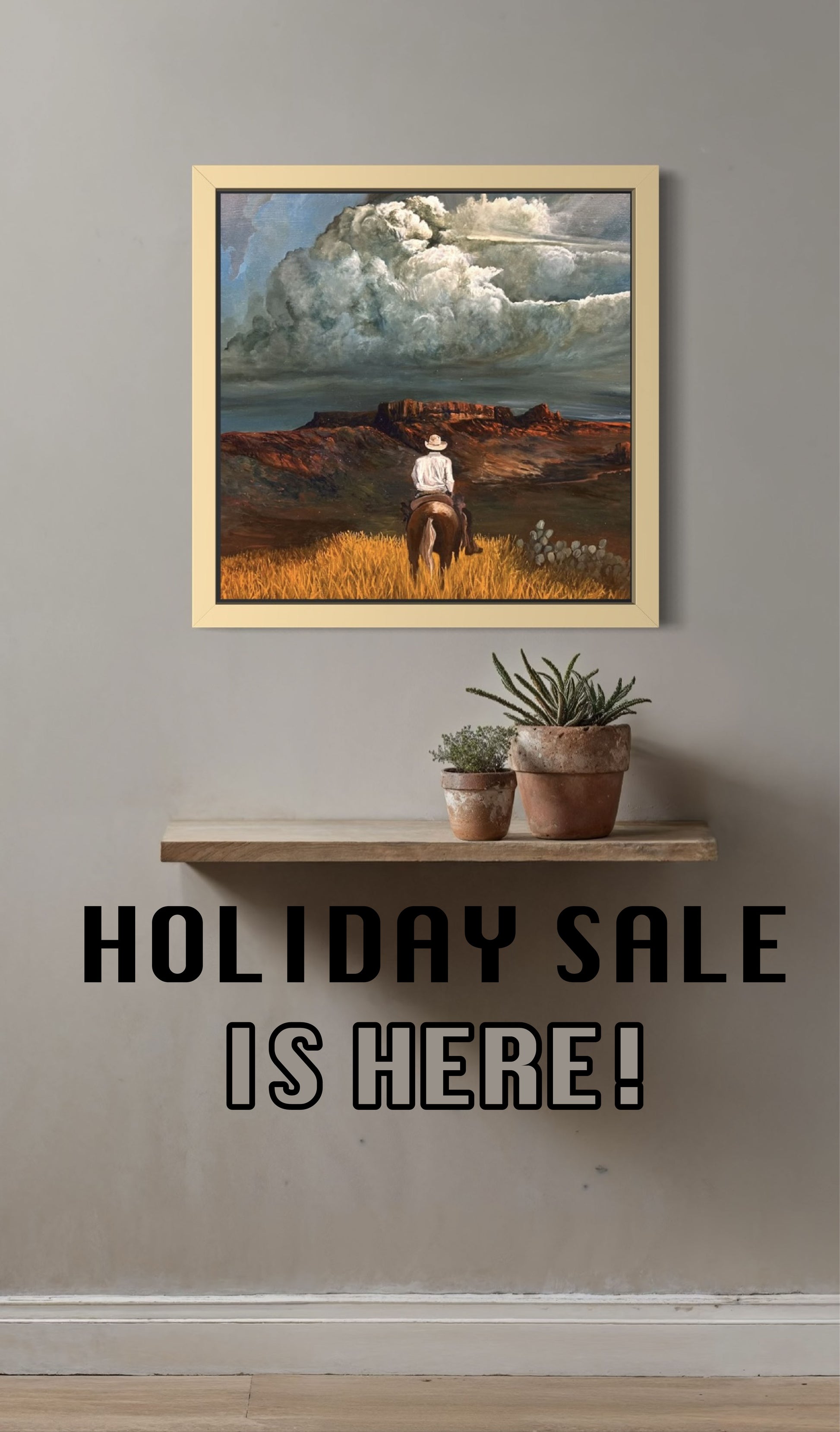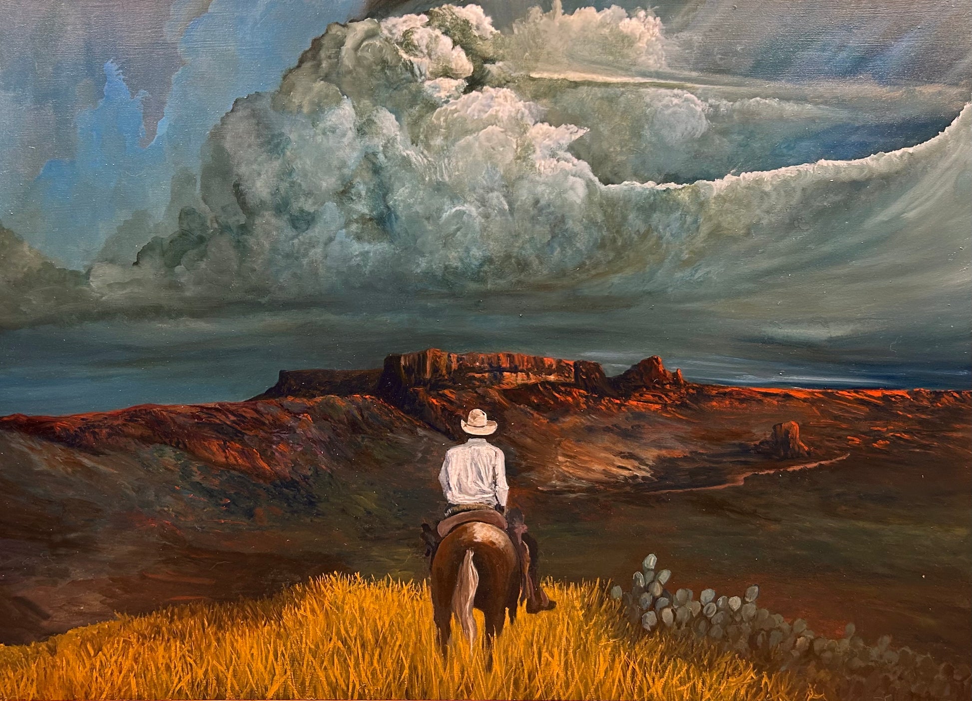 Capture the vast beauty and dramatic skies of the American West with this fine art print, reproduced from my original oil painting. The artwork features a lone cowboy on horseback overlooking a sweeping desert landscape, glowing with warm golden light as towering storm clouds rise above distant mesas. The scene embodies freedom, solitude, and the timeless spirit of the West.
