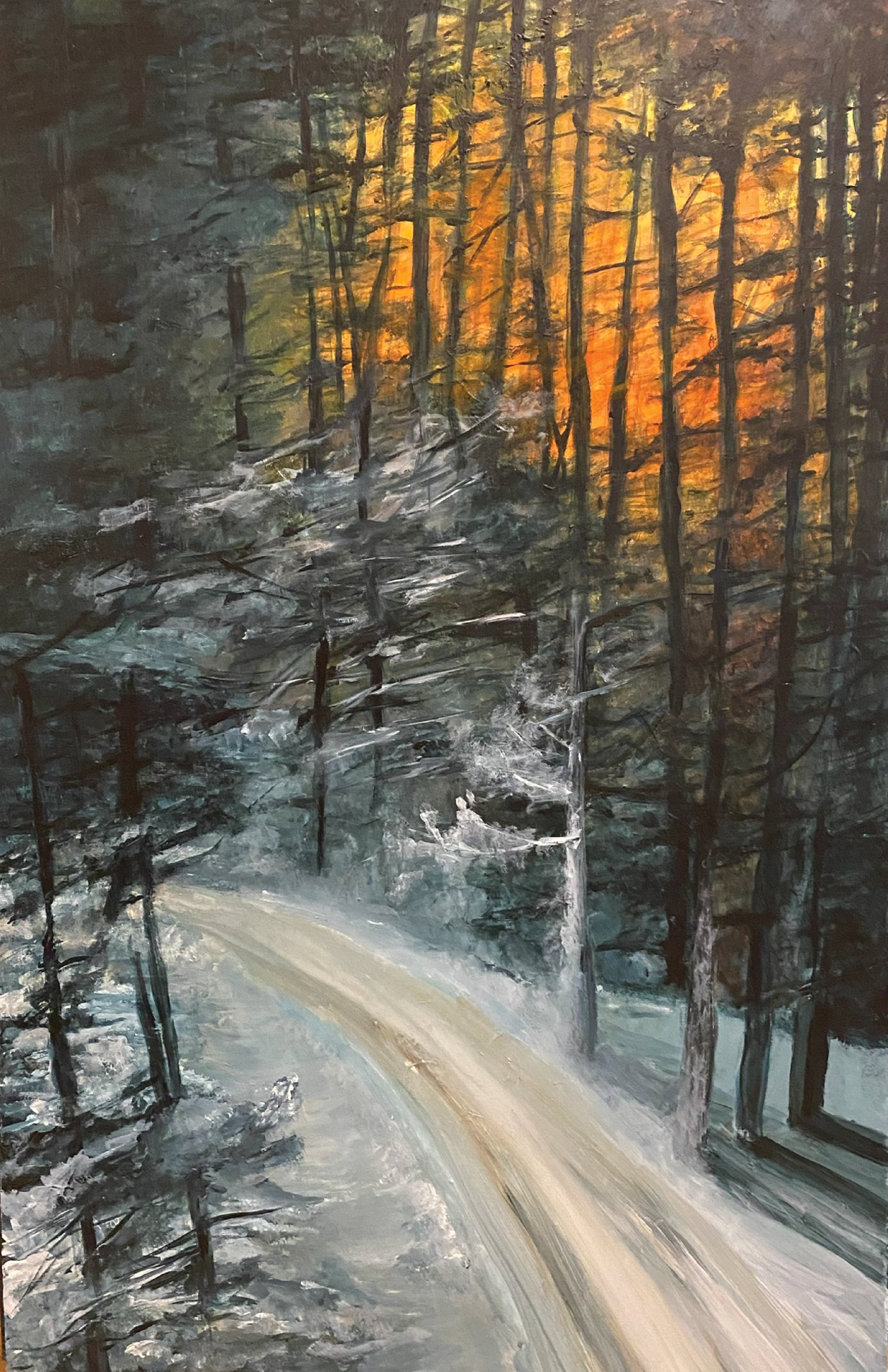 winter forest painting, sunset forest landscape, snow-covered trees artwork, serene nature print, atmospheric forest oil painting, winter sunset wall art, dense forest landscape print, peaceful winter scenery, tranquil nature artwork, forest silhouette painting, seasonal landscape oil print, woodland sunset art, winter woods wall decor