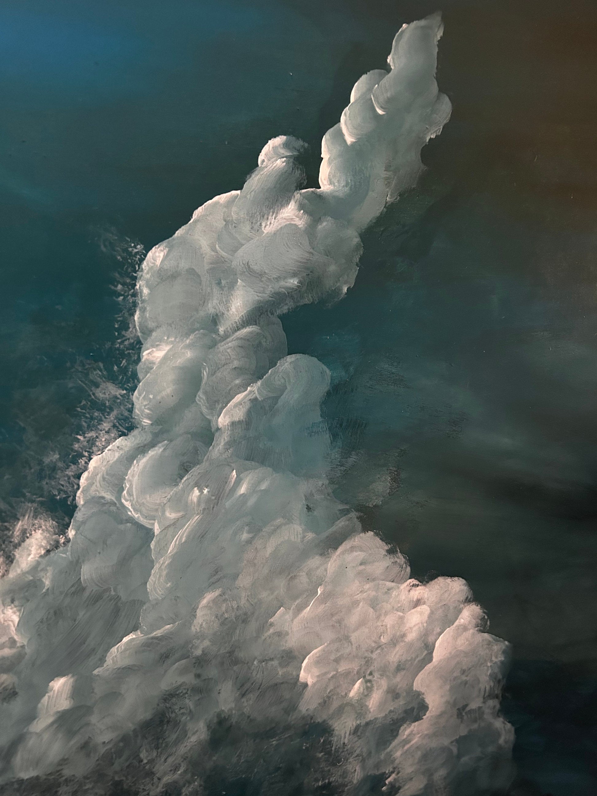 Transport yourself to the heart of nature's fury with this electrifying painting showcasing a colossal thunderhead dominating the sky. Witness the raw power of the elements as a lightning bolt strikes within the ominous clouds, illuminating the tumultuous scene with its brilliant flash. Feel the intensity and drama as the artist captures the essence of a raging storm in vivid detail, creating a mesmerizing display of light and shadow. Immerse yourself in the awe-inspiring spectacle of nature's might depicted in this breathtaking artwork.