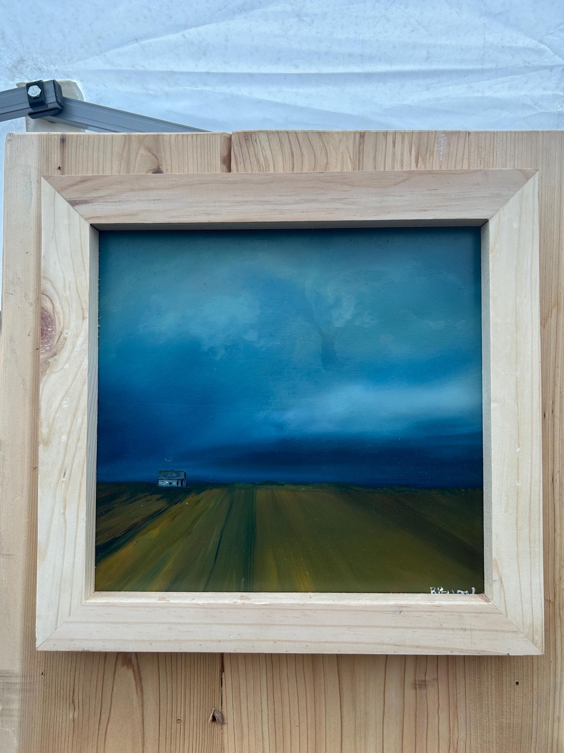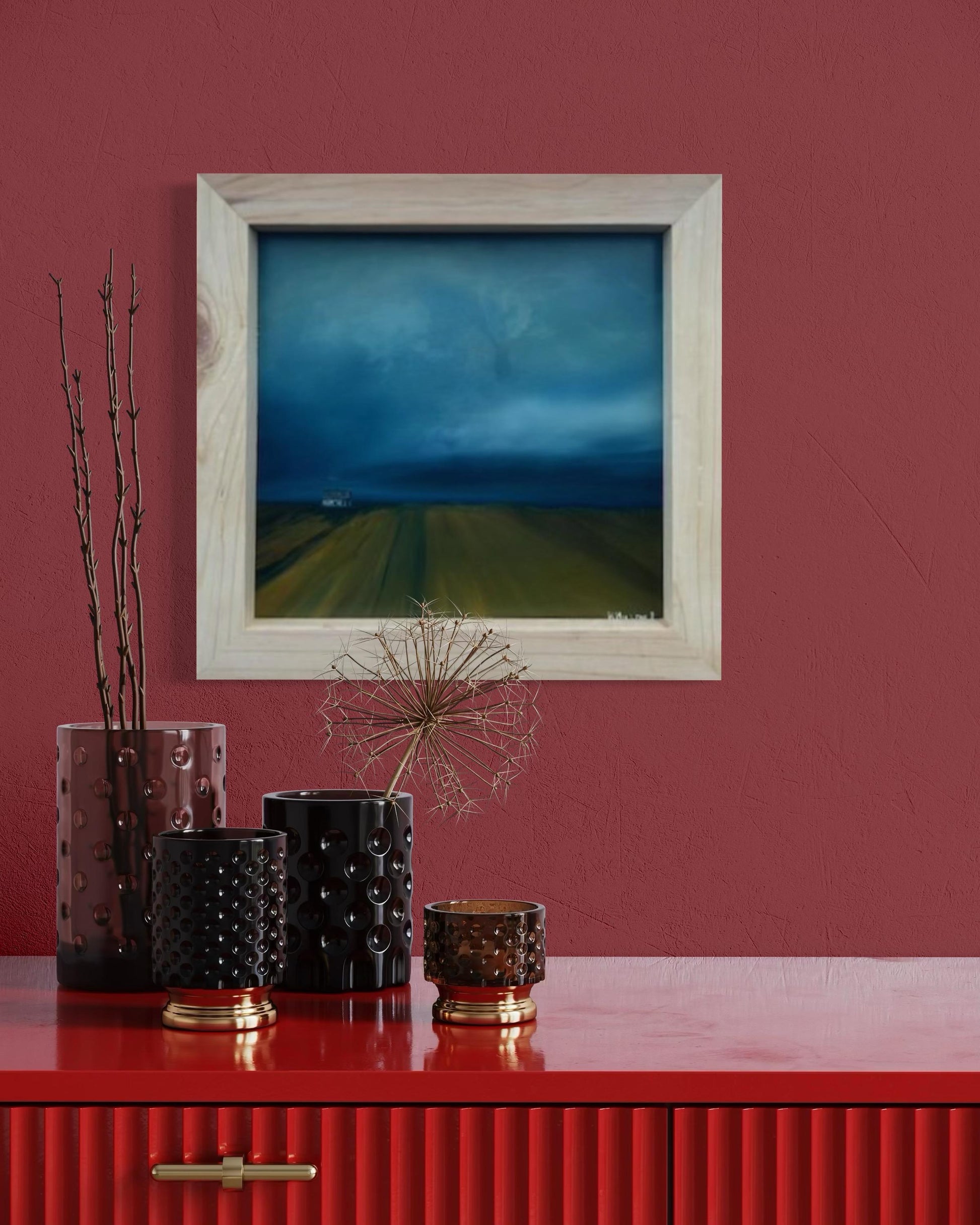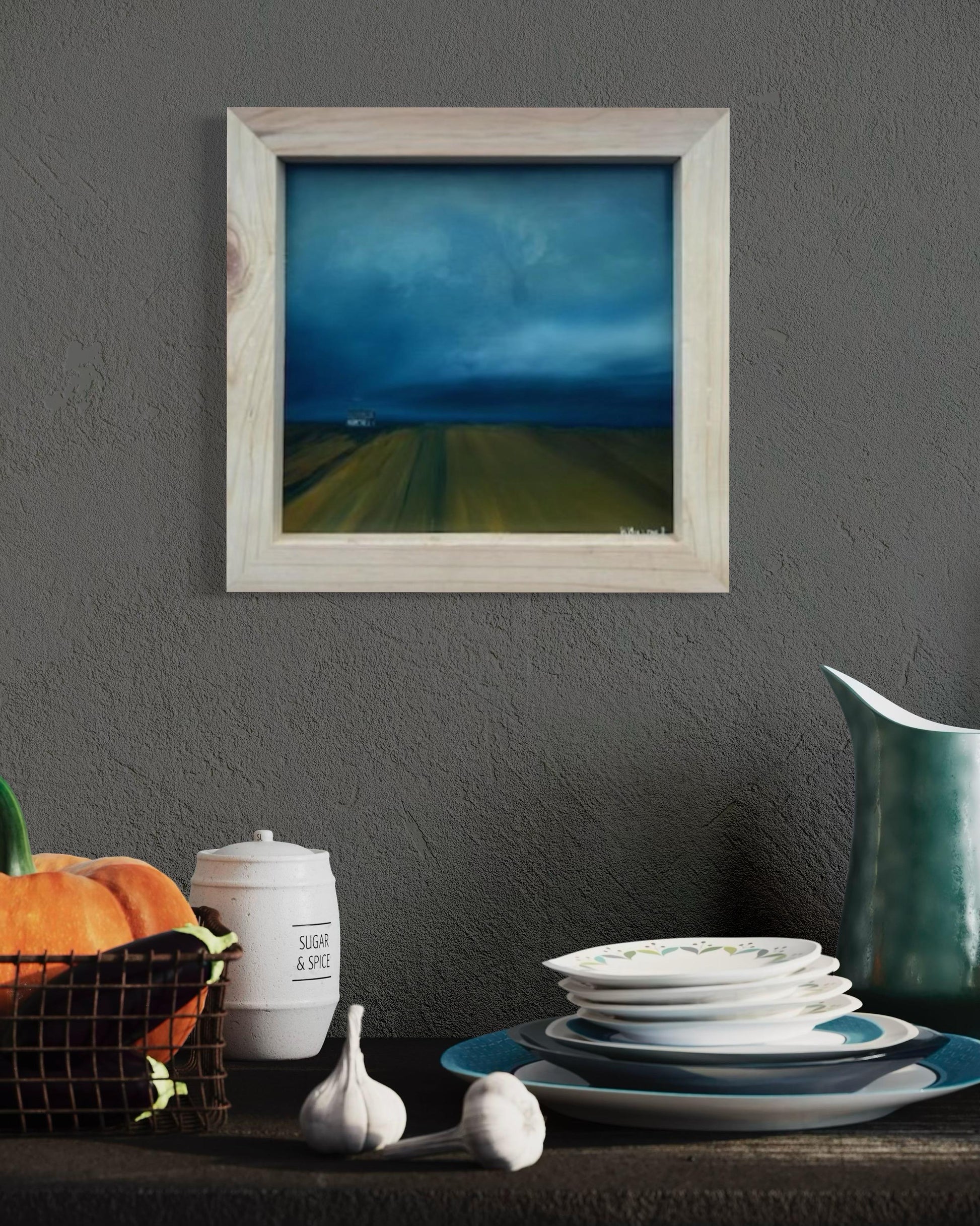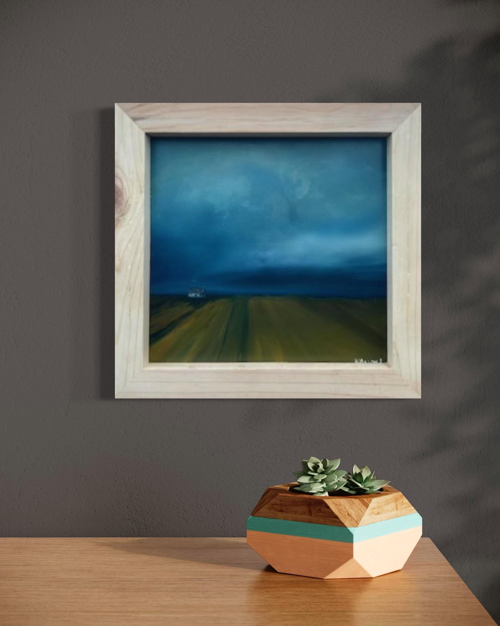 Discover a captivating oil painting of a dreary farm landscape, perfect for adding a touch of rustic charm to your home. This artwork features a dramatic scene with large storm clouds looming in the distance, casting a moody atmosphere over the serene countryside. Rows of meticulously tilled soil lead the eye towards a distant farmhouse, evoking a sense of solitude and timelessness. Ideal for lovers of rural art and those who appreciate the beauty of stormy skies and agricultural vistas. Enhance your space with this evocative, hand-painted piece that captures the essence of a tranquil yet intense farm setting.Rural, Moody, Rustic Perfect For: Farmhouse decor and Country-themed rooms. Art collectors Bring home this unique, stormy farm landscape painting and infuse your decor with its dramatic beauty and atmospheric depth