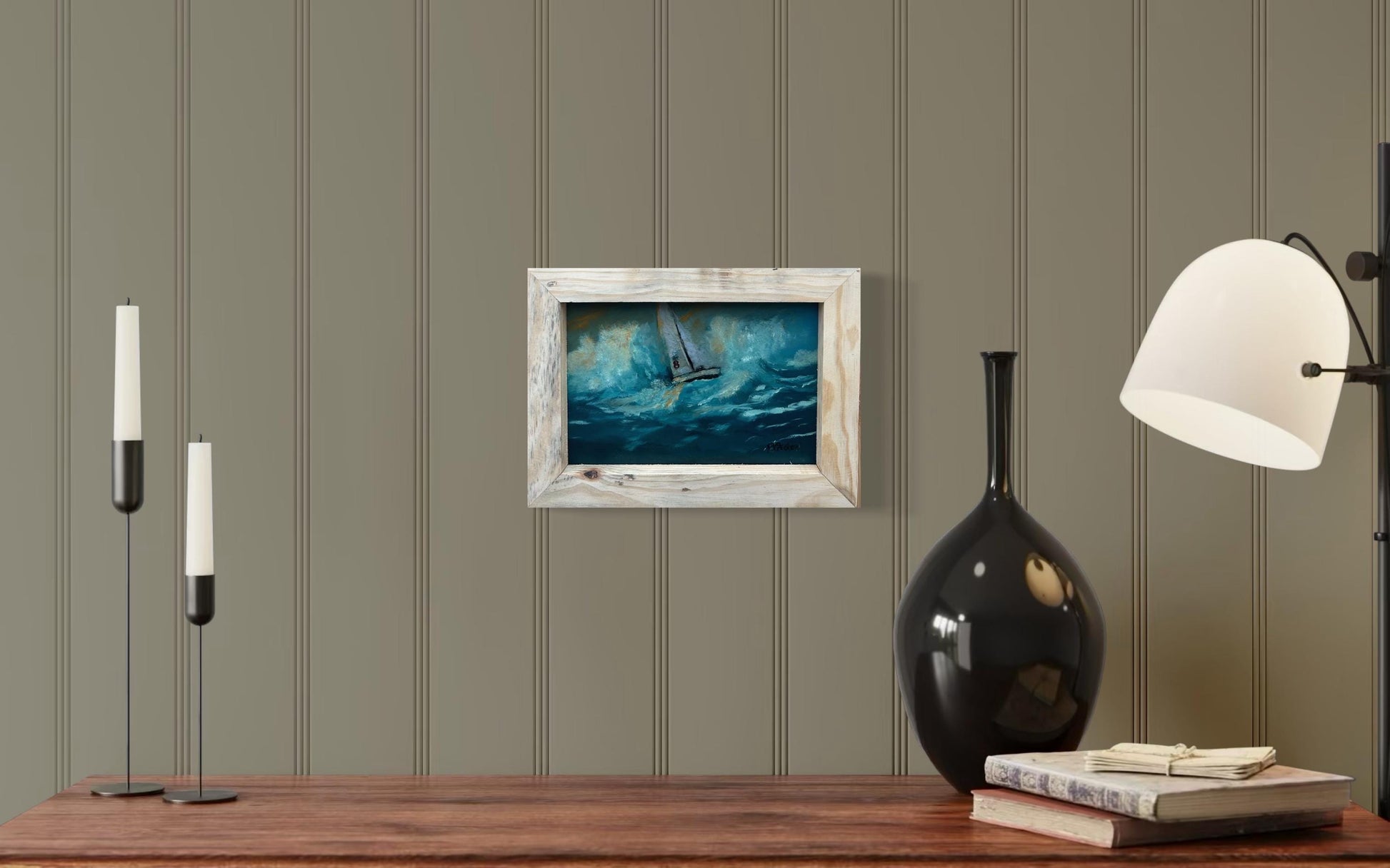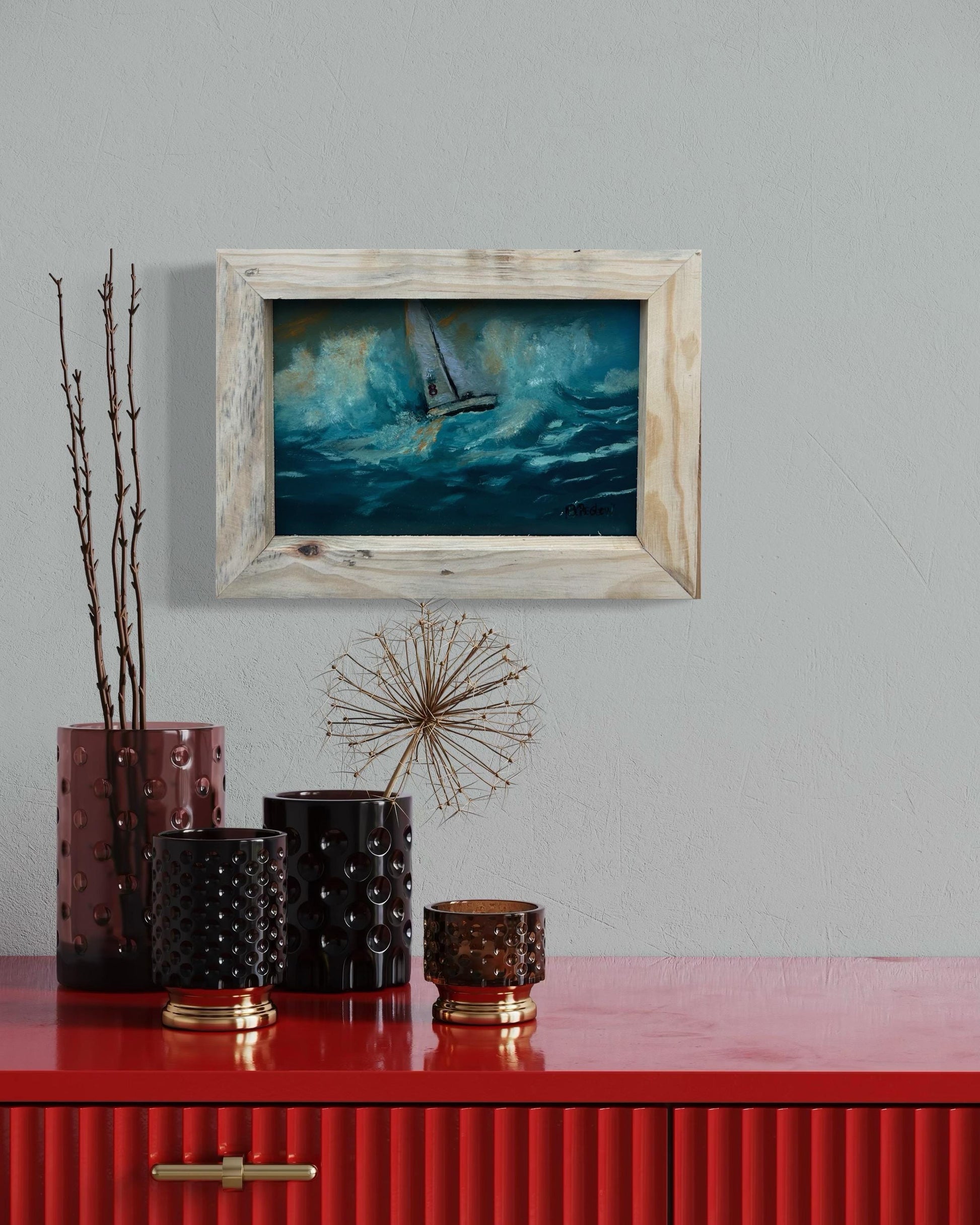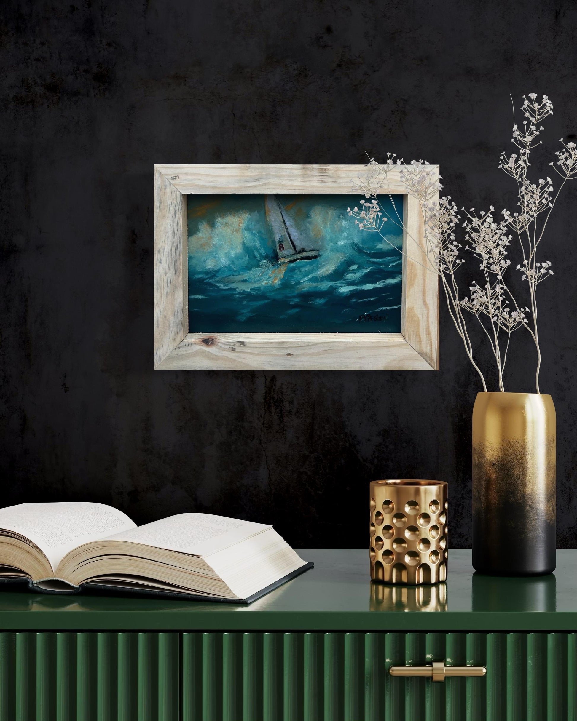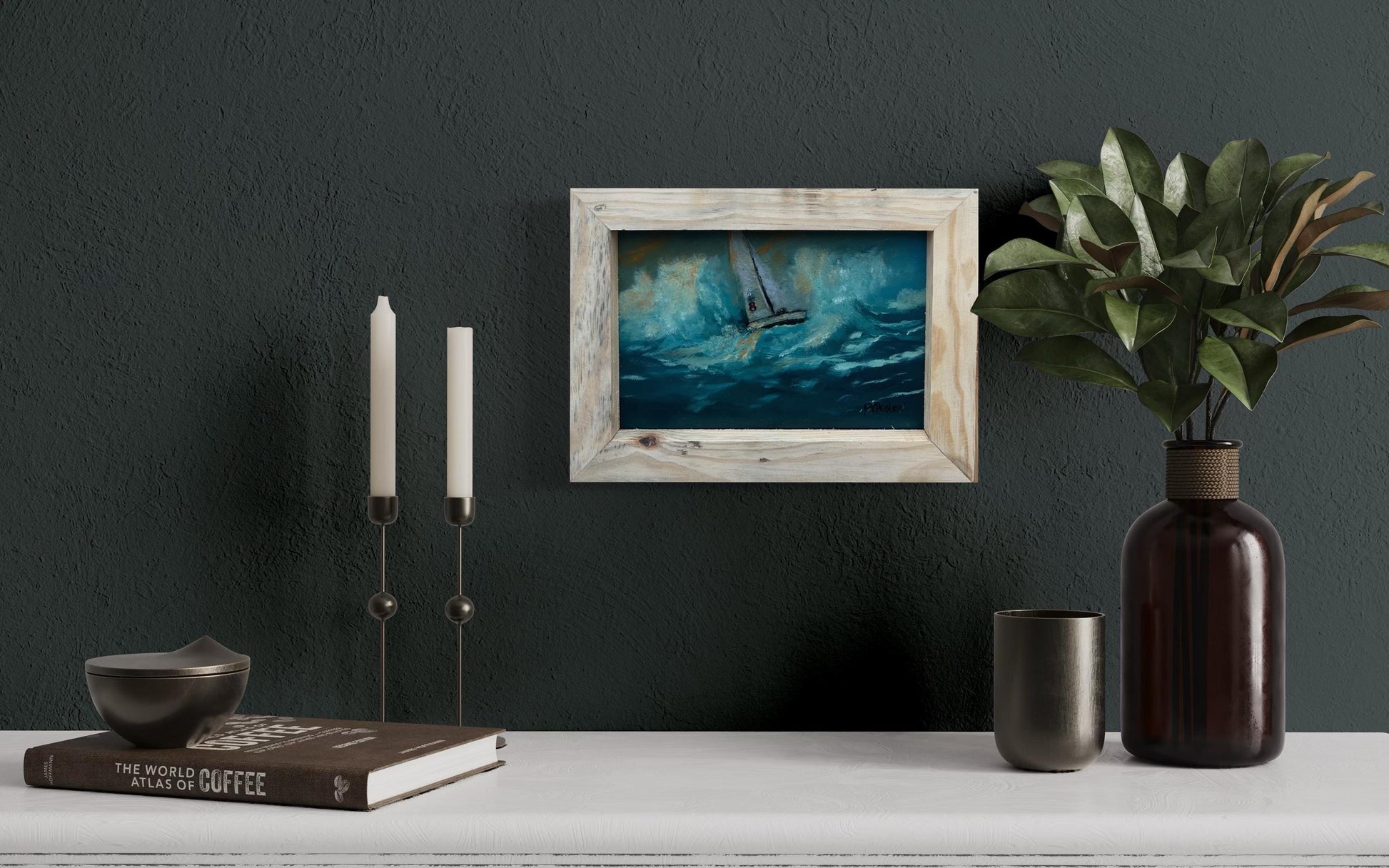 Immerse yourself in the dramatic beauty of the ocean with this striking oil painting of a small sailboat battling large waves on the open sea. The artwork captures the intense motion of the waves and the resilience of the sailboat, creating a powerful and dynamic maritime scene. The vivid brushstrokes and deep blues convey the raw energy of the sea, while the detailed depiction of the sailboat adds a touch of realism and adventure. Perfect for nautical enthusiasts, sea lovers, or anyone looking to add a sense of movement and drama to their decor. This piece brings the thrill of the open ocean into your home, making it a stunning focal point for any room.