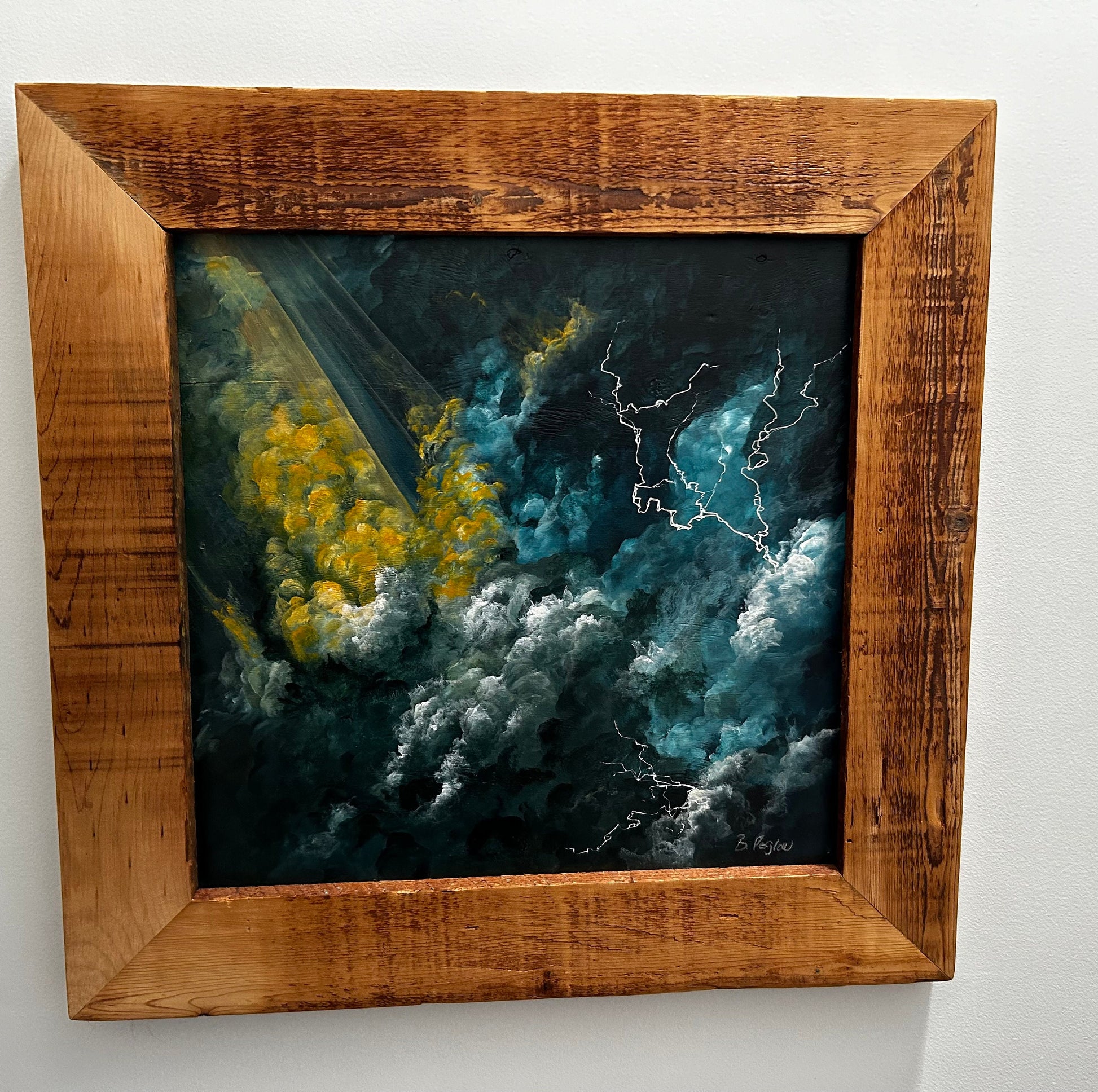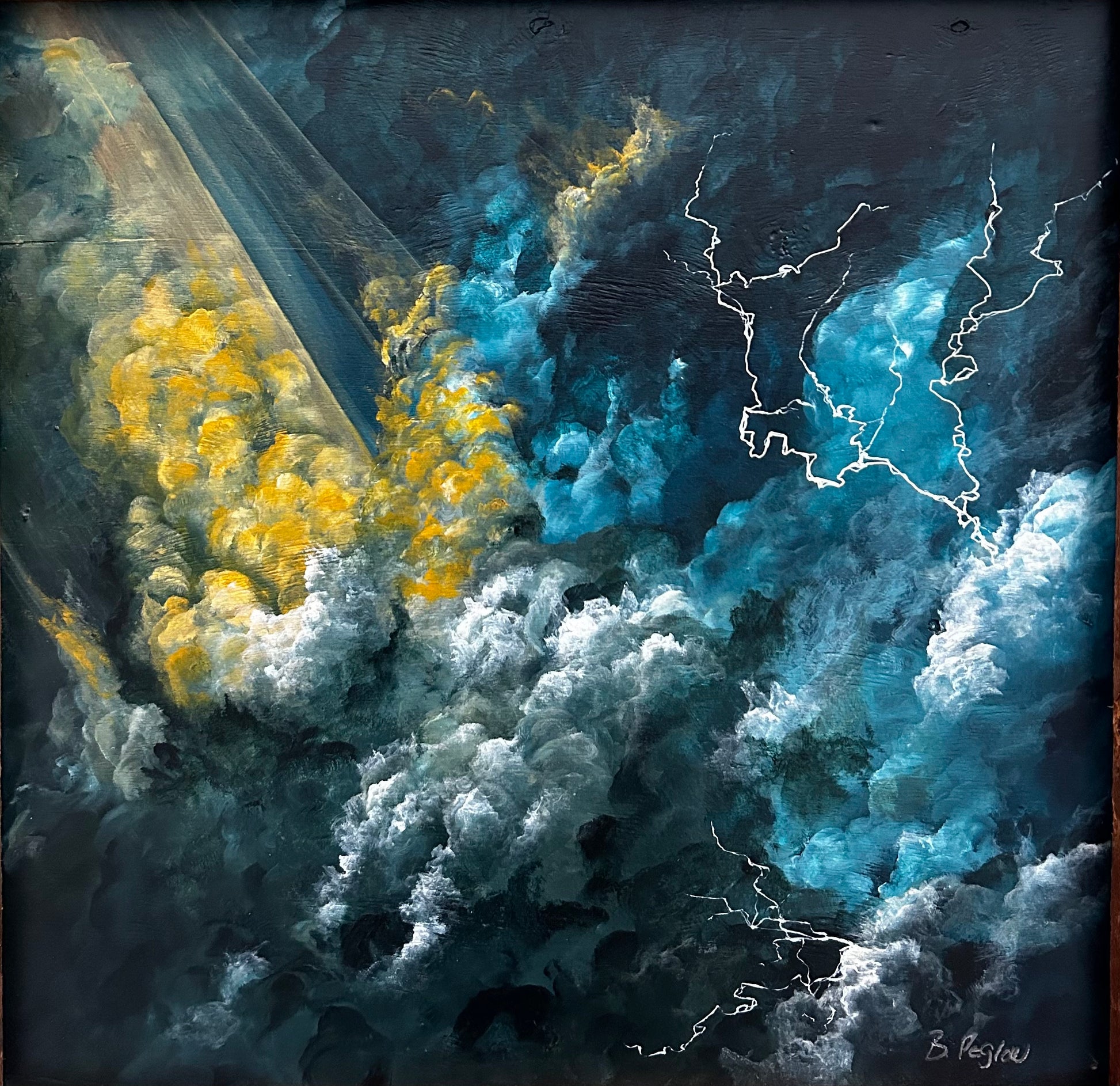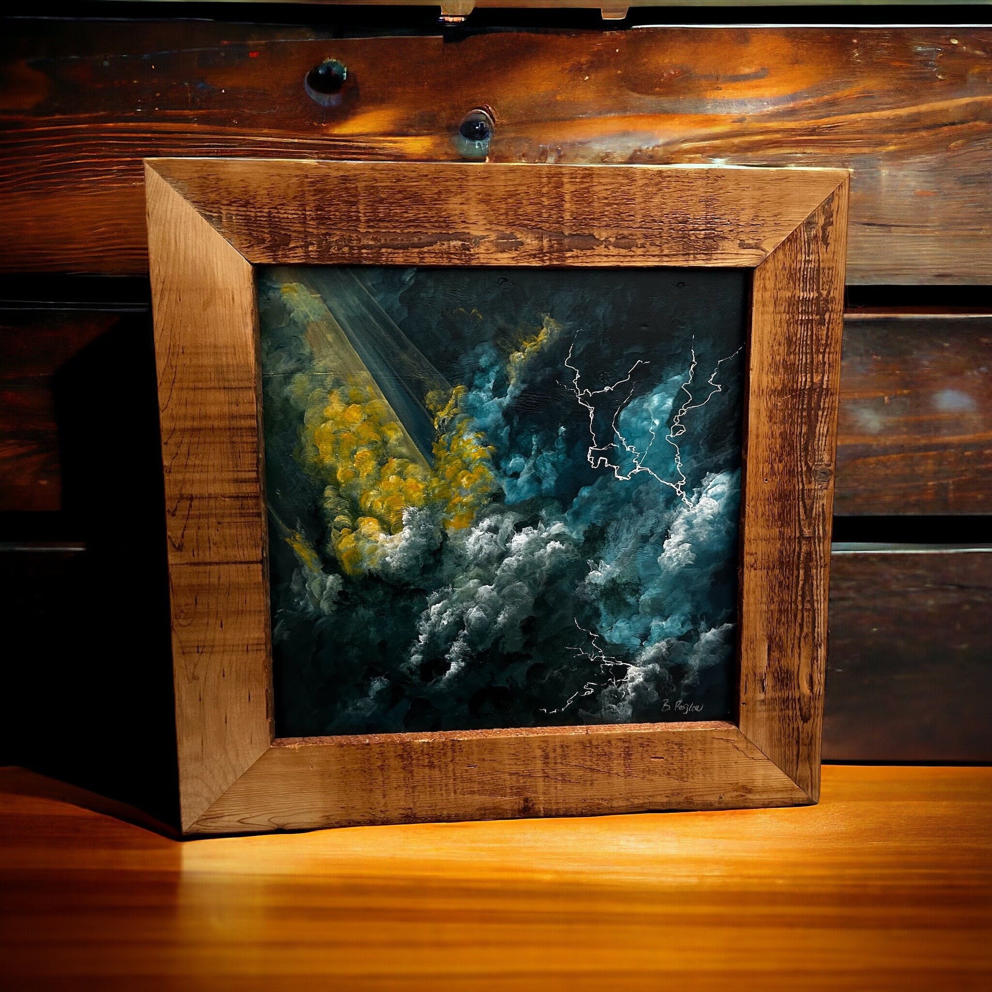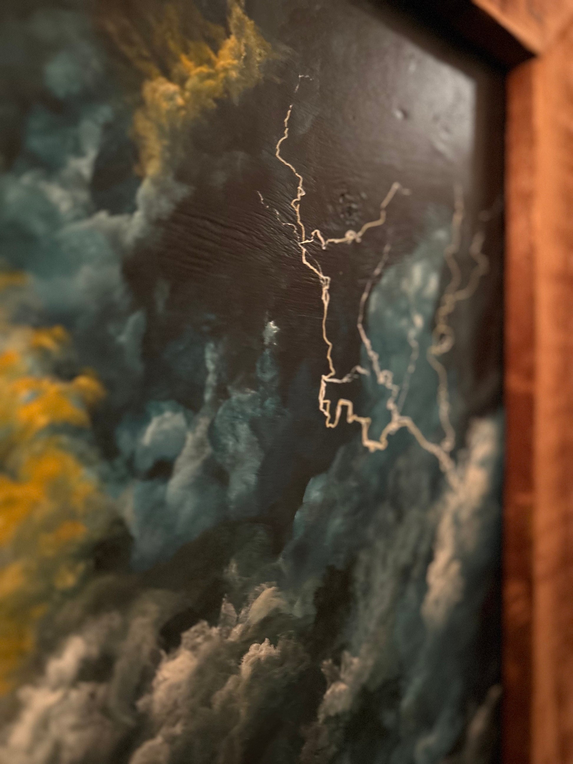 Behold the awe-inspiring majesty of nature captured in this stunning painting a colossal thunderhead dominating the sky. Witness the raw power of the storm as a brilliant lightning bolt illuminates the heart of the cloud, electrifying the atmosphere with its intensity. Experience the palpable energy and dynamic tension as the storm gathers strength, commanding attention with its sheer magnificence.