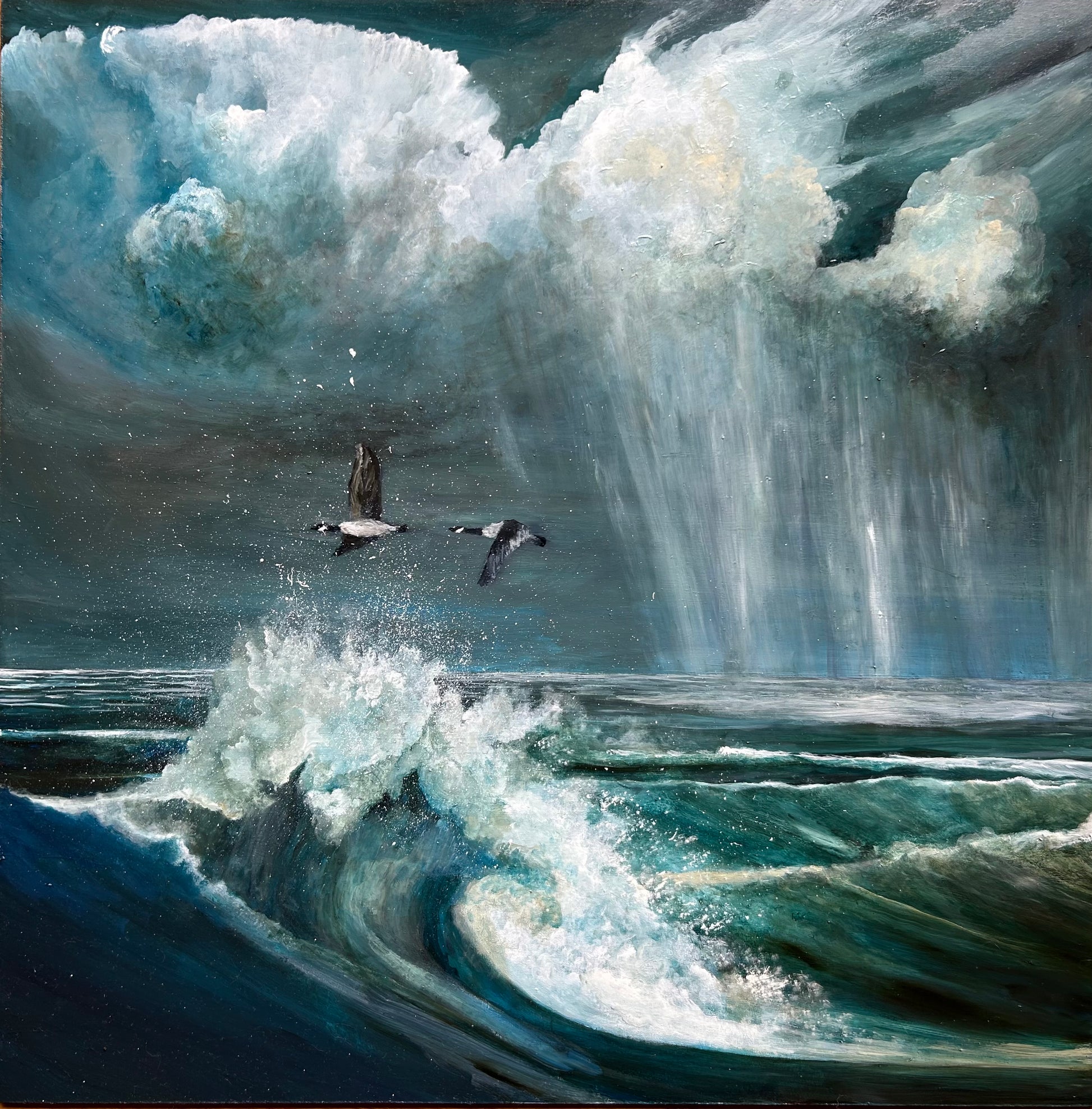 Bring the raw power and breathtaking drama of the sea into your space with this stunning print made from the original oil painting “On the Fly.” This artwork captures a surging ocean wave exploding into white spray, while two birds glide effortlessly above the storm, framed by towering clouds and cascading sheets of rain.