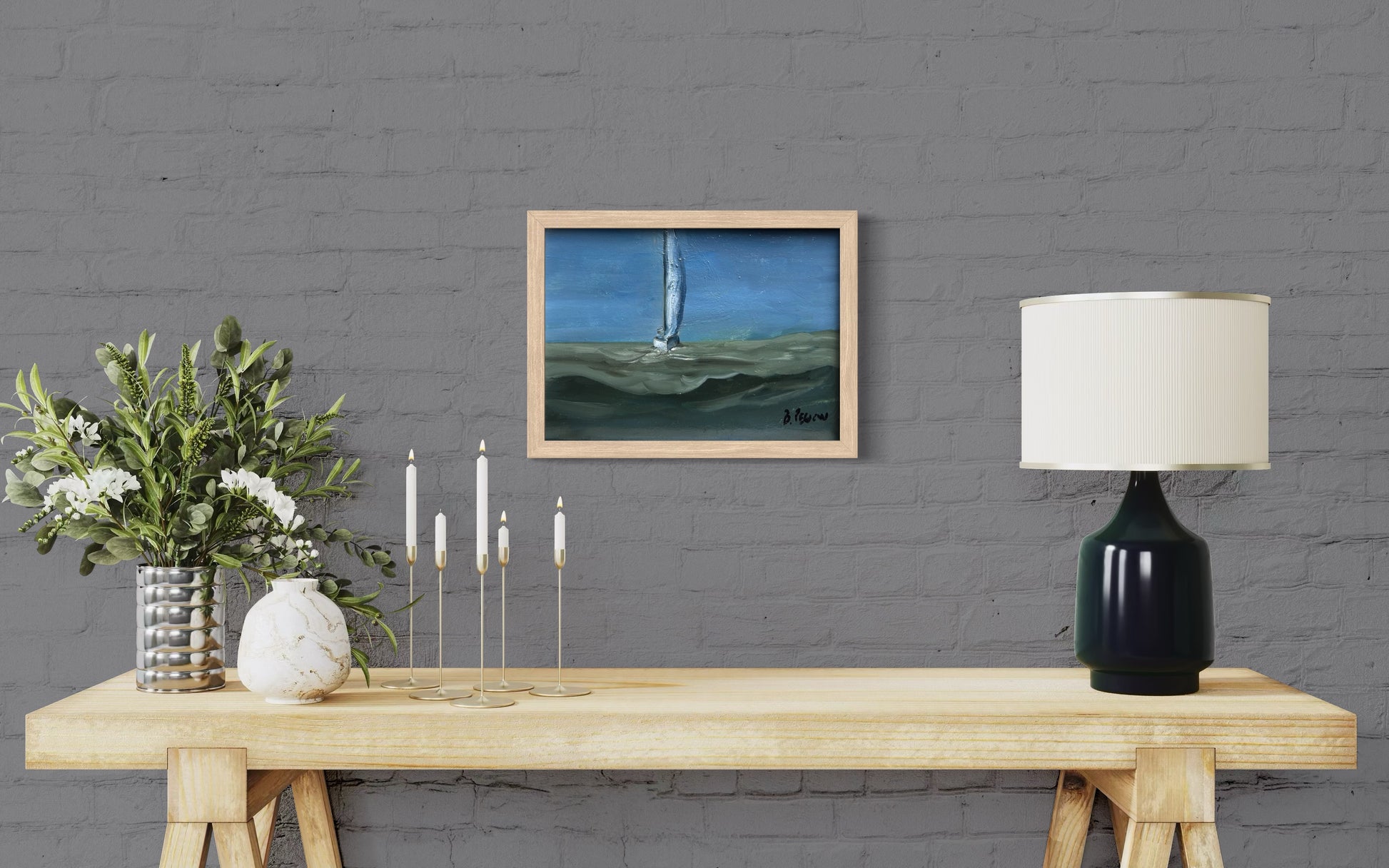 Experience the power and drama of the open ocean with this original oil painting of a sailboat battling rough seas beneath dark, brooding clouds. The churning waves crash against the hull as the boat leans into the storm, capturing the raw tension between nature’s fury and human determination. Deep blues, storm-streaked grays, and textured brushwork create a dynamic, atmospheric seascape filled with movement and emotion.